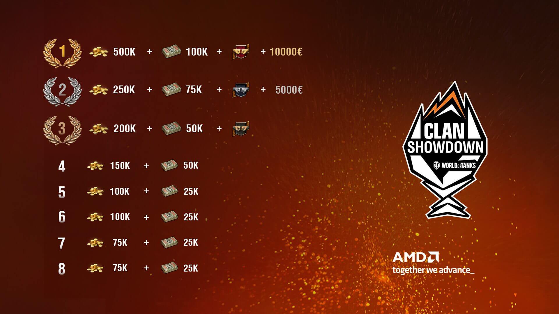 This Clan Showdown is powered by AMD, delivering cutting-edge performance on every battlefield. AMD's technology fuels the competitive spirit and precision that defines World of Tanks esports. The top-performing teams are playing for a grand total of €15,000 in addition to gold, bonds, and glory.