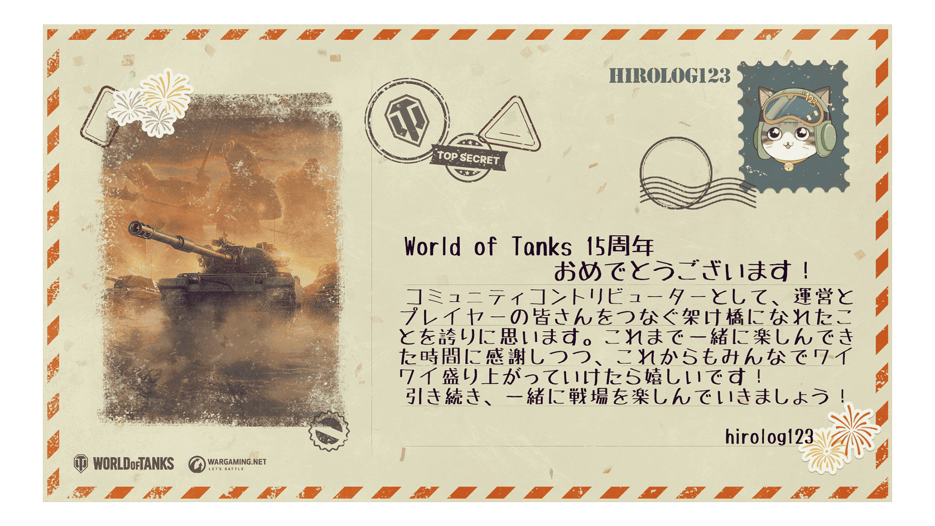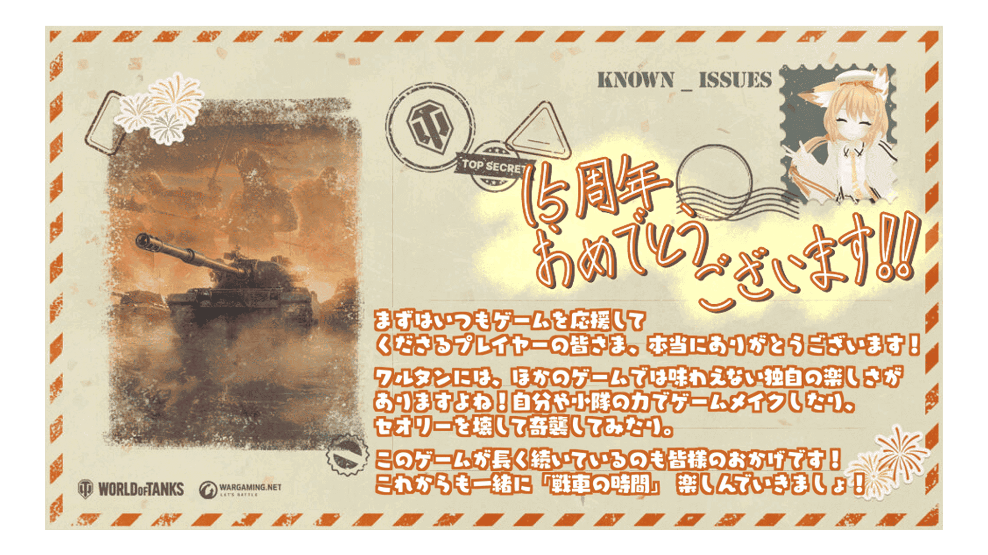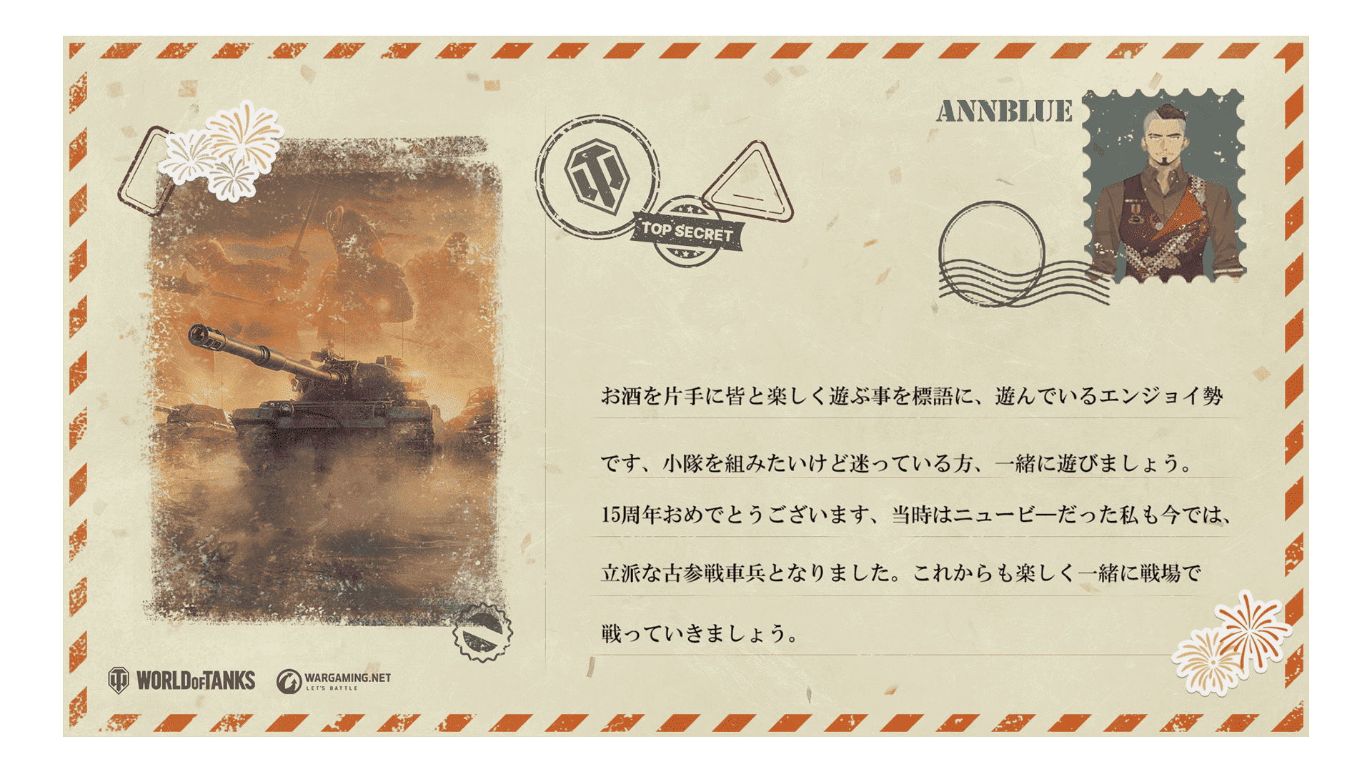 これは単なる《バースデー》ではありません。戦車長の皆さんが戦ったすべての戦闘と、支えてきたすべてのチームメイトへの賛辞です。ともに15年間の戦車、チームワーク、そして偉勲を祝いましょう!