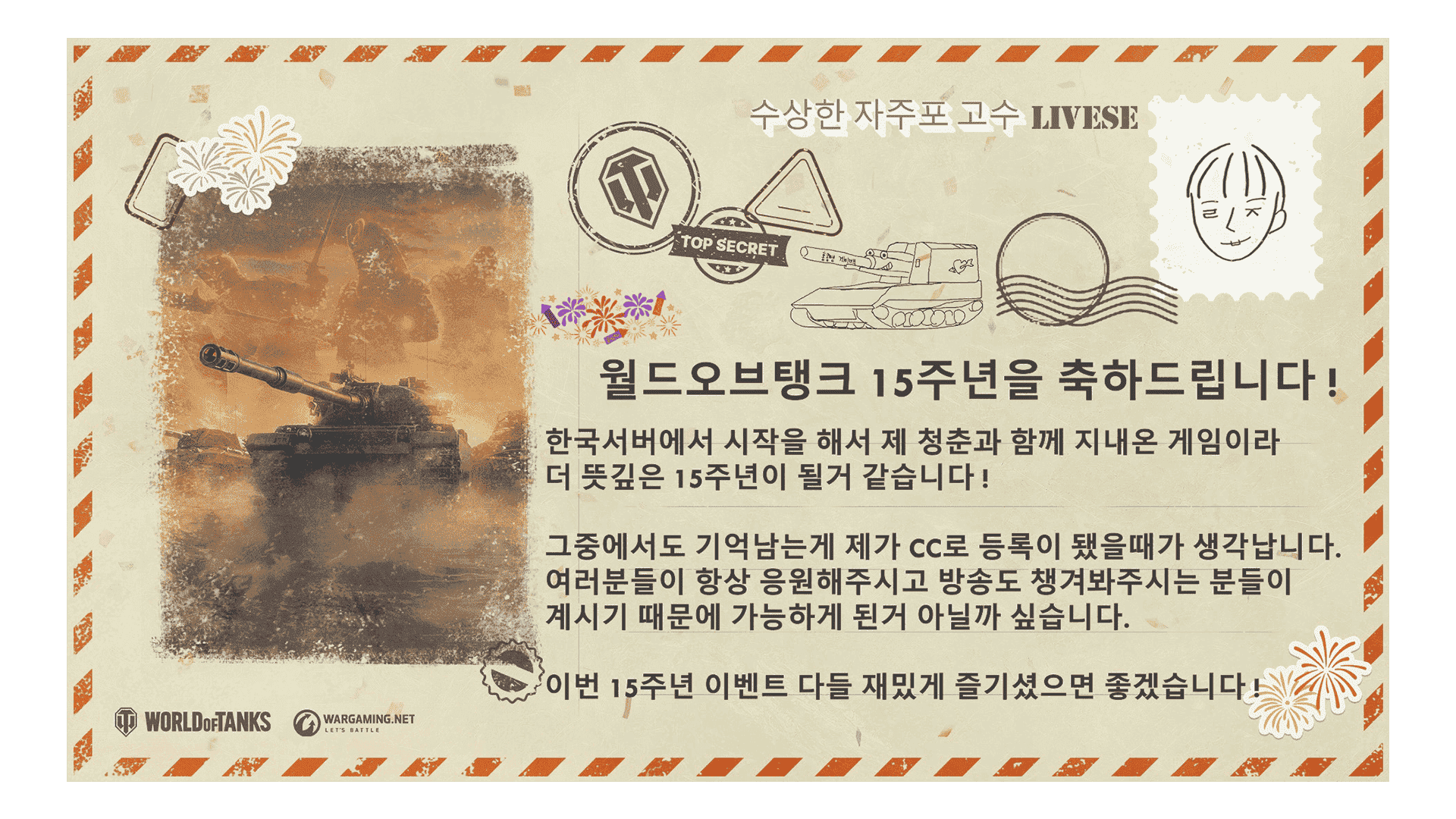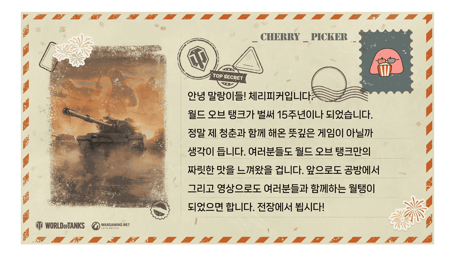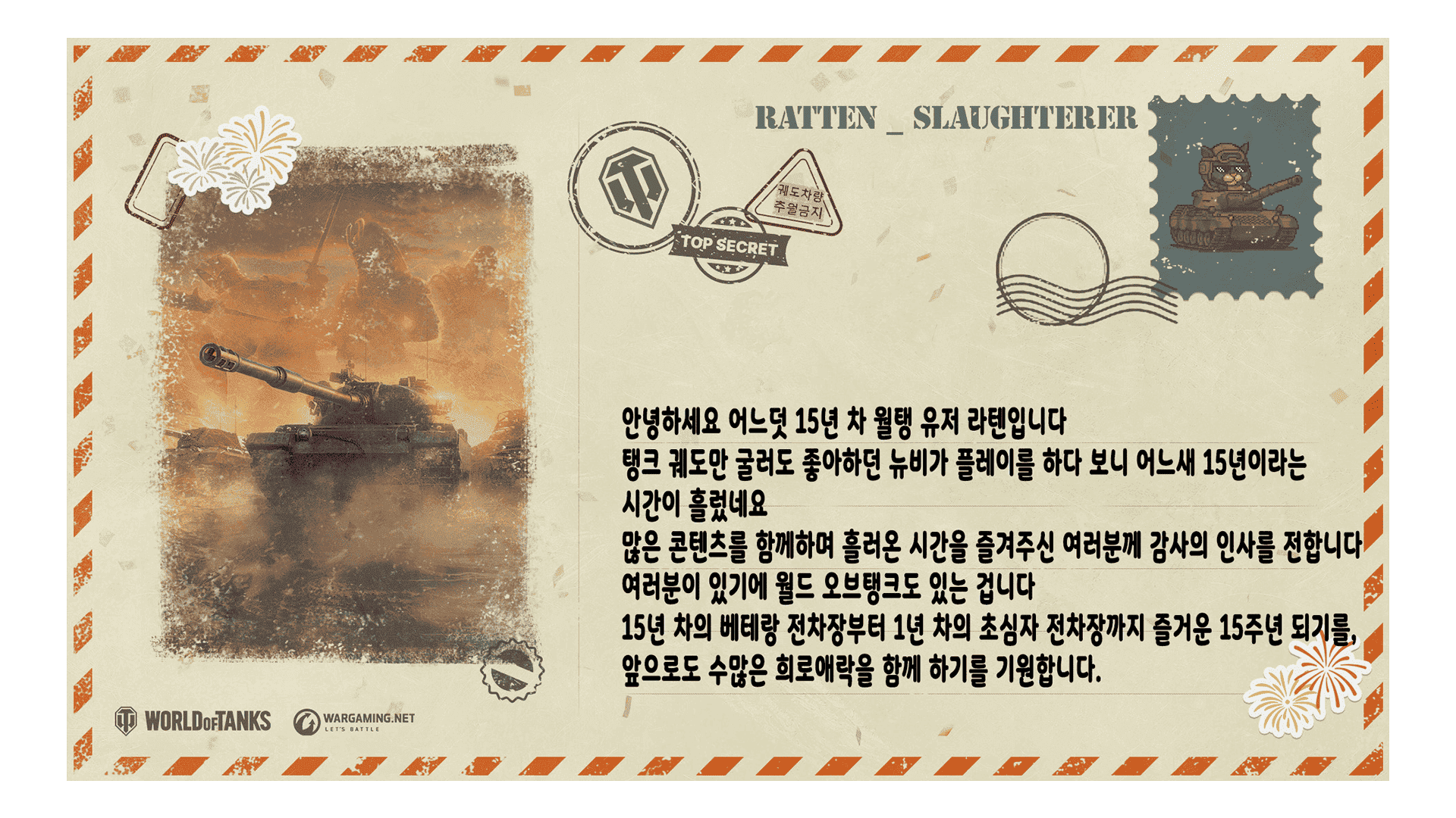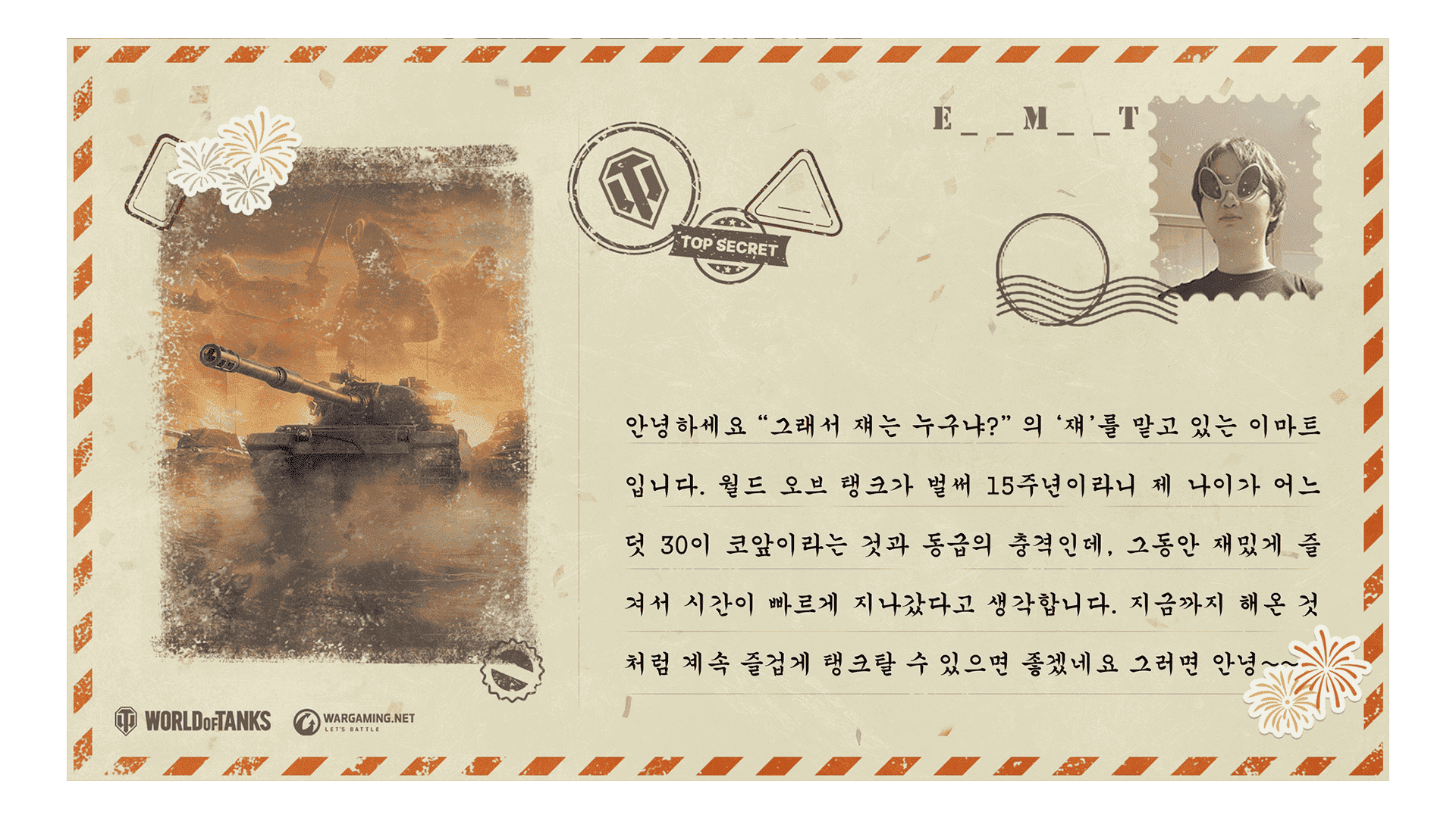 안녕하세요 “그래서 쟤는 누구냐?” 의 ‘쟤’를 맡고 있는 이마트입니다. 월드 오브 탱크가 벌써 15주년이라니 제 나이가 어느덧 30이 코앞이라는 것과 동급의 충격인데, 그동안 재밌게 즐겨서 시간이 빠르게 지나갔다고 생각합니다. 지금까지 해온 것처럼 계속 즐겁게 탱크 탈 수 있으면 좋겠네요. 그러면 안녕~~