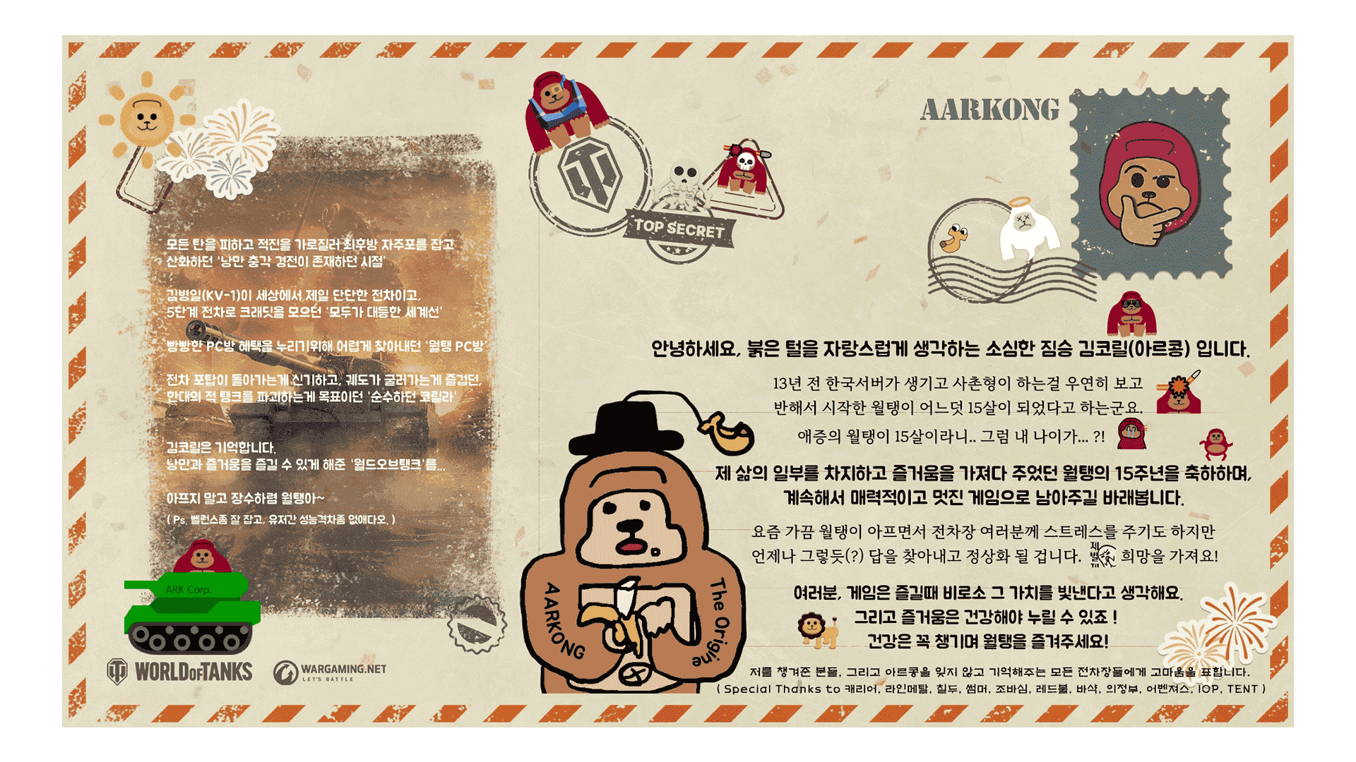 단순한 게임 출시 기념일을 넘어, 지금껏 참여한 전투, 만난 팀원을 되돌아보는 시간이 되었으면 좋겠습니다. 전투와 전우애, 전승이 가득했던 지난 15년을 함께 기념해 주십시오.