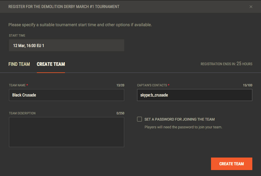 2.1 "팀 결성"을 클릭하십시오. 표시된 창에서 원하는 토너먼트 시작 시간을 설정할 수도 있습니다.