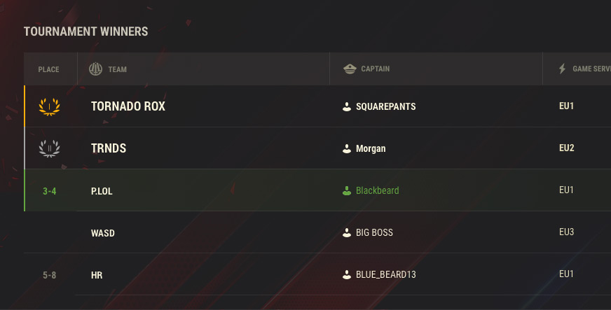 토너먼트 결과가 해당 토너먼트 페이지에 표시됩니다. 이곳에서 토너먼트 참가팀의 전체 순위를 확인할 수 있습니다. 소속팀이 보상을 받으면 상품이 자동으로 계정에 추가됩니다.